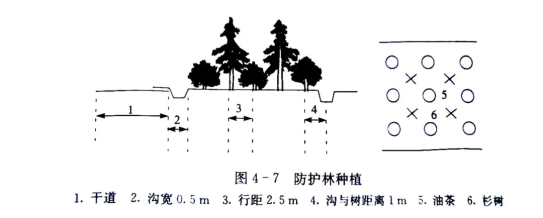 一般栽喬木型樹種2至3行,行距2至3米,前后交錯,栽成三角形,兩旁栽灌木型樹種。