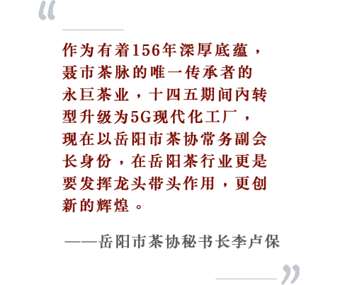 在授牌儀式上,臨湘市茶業(yè)協(xié)會(huì)會(huì)長黃生波表示,永巨是臨湘茶業(yè)的一面旗幟,此項(xiàng)榮譽(yù)不僅僅是一家企業(yè)的榮譽(yù),更是臨湘的榮譽(yù)。