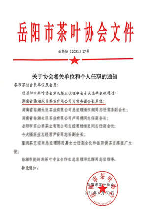 永巨茶業(yè),成為岳陽市茶協(xié)第二家常務(wù)副會(huì)長單位。